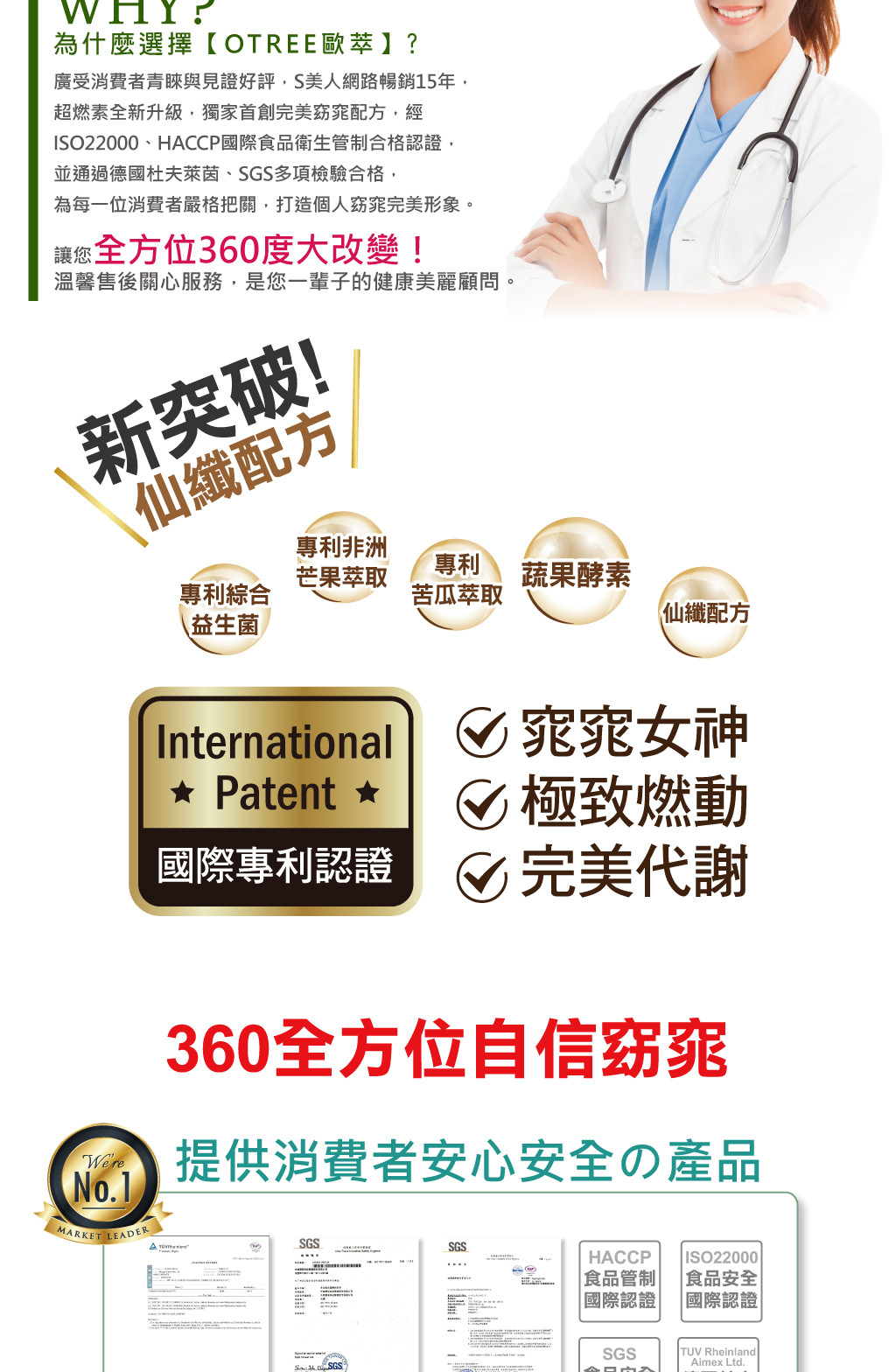成 分:綜合蔬果酵素粉、專利綜合益生菌、綠茶萃取物、白腎豆萃取物、磷酸鈣、綜合蔬果抽出物、專利松樹皮萃取物、專利複合甘胺酸鋅、苦瓜萃取物(含專利胜肽)、神仙菜萃取物、專利非洲芒果種子萃取物、綠咖啡萃取物、苦橙萃取物、薑黃萃取粉、黑胡椒萃取物、啤酒酵母B群、海水抽出物(含鎂)。