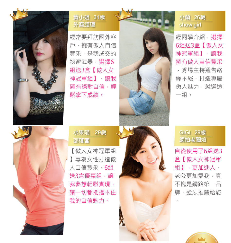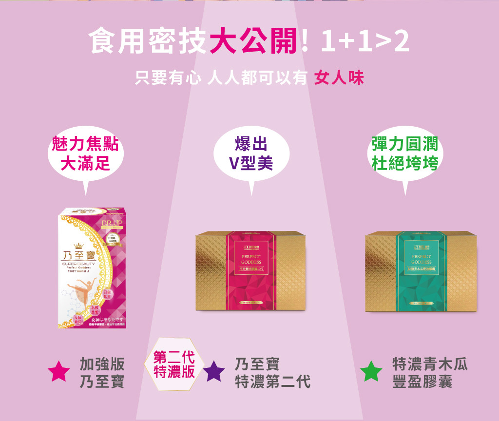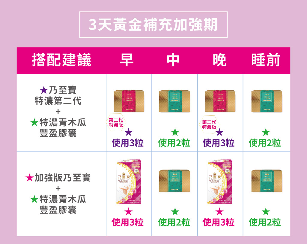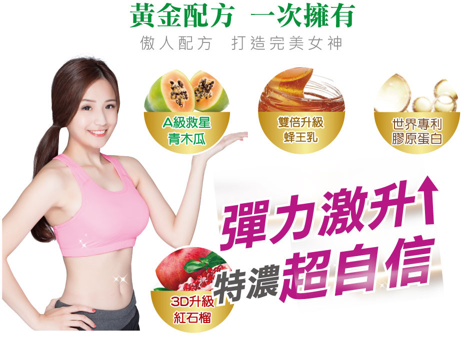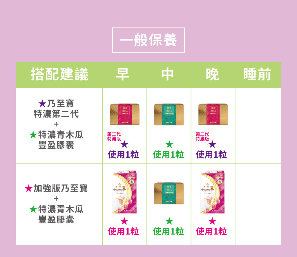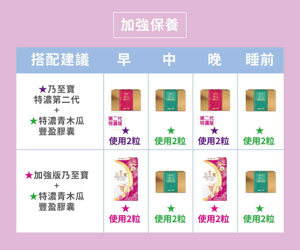 ‧乃至寶使用期間建議搭配【特濃青木瓜豐盈膠囊】、【鑽透膠原蛋白美顏粉】或【活力美胸精華按摩使用】,使目標更快速達成。