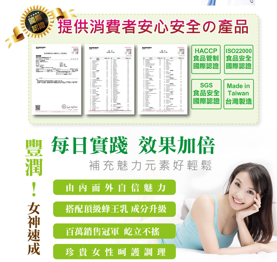 成 分:青木瓜萃取物、專利蜂王乳、專利素食人蔘膠原蛋白、野石榴萃取物、麥芽糊精、二氧化矽