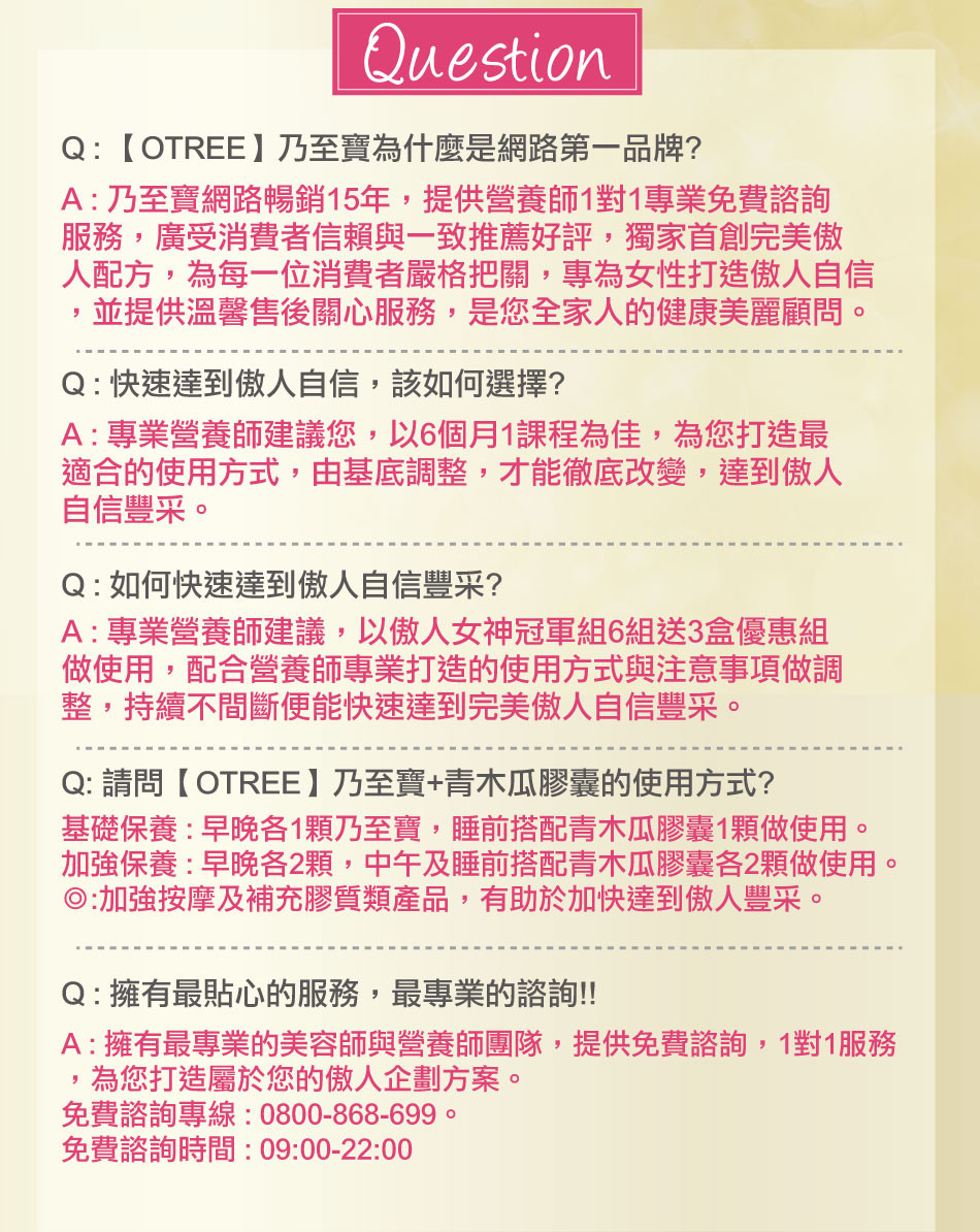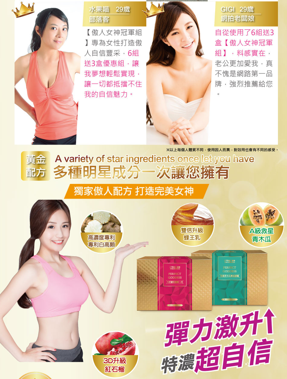 ‧乃至寶使用期間建議搭配【特濃青木瓜豐盈膠囊】、【鑽透膠原蛋白美顏粉】或【活力美胸精華按摩使用】,使目標更快速達成。
